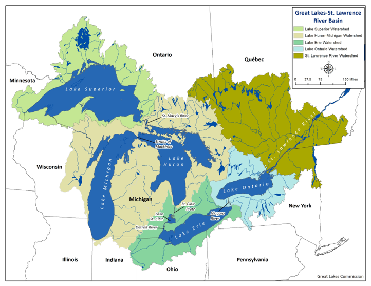 The Great Lakes-St. Lawrence River Basin is the single largest watershed in the world, ranging from Trois-Rivières, Québec to beyond the western point of Lake Superior. It contains more than 20% of the world's supply of surface fresh water and about 84% of North America's surface fresh water.